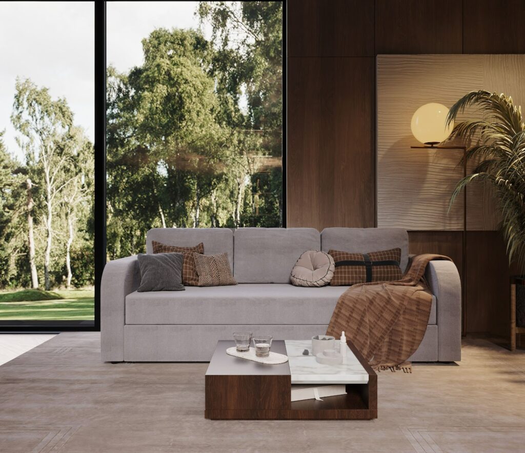 • Розмір і форма. Для просторих віталень підійдуть кутові або модульні моделі, які можна переставляти за бажанням. Для невеликих кімнат — компактні прямі дивани або варіанти з вузькими підлокітниками.